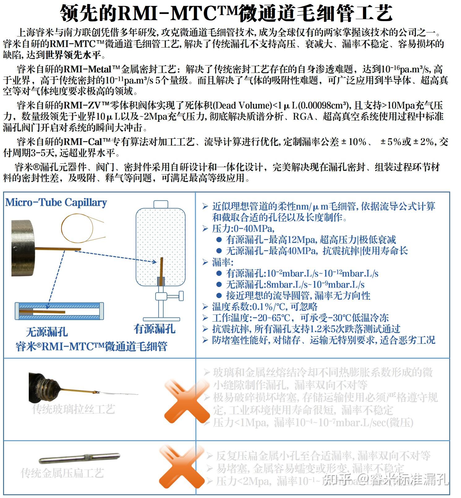 RMI-MTC™微通道毛细管工艺, 解决了传统漏孔不支持高压、衰减大、漏率不稳定、容易损坏的缺陷, 达到世界领先水平。制作的漏孔有如下特性:
