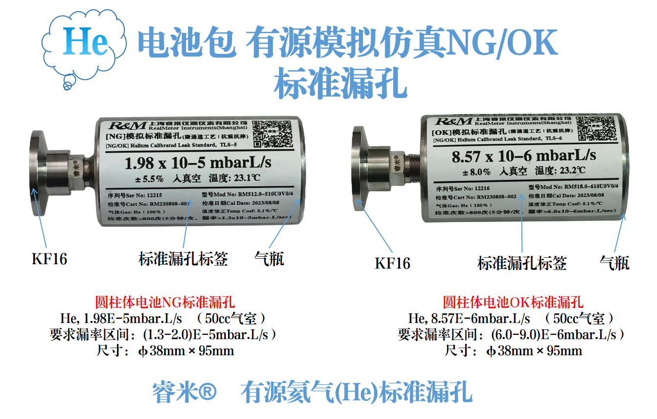 很多行业、众多产品,为了确保检测产品的密封情况。在检漏的时候,都会有模拟仿真件的需要。睿米公司可以根据用户的要求,定制标准漏孔,用于模拟仿真检漏。下面是在电池包检漏中的应用。用户定制两个相近漏率的标准漏孔,1个标准漏孔的漏率略大于用户的检漏标准,作为NG件;另1个标准漏孔的漏率,略小于用户的检漏标准,作为OK件。这两个NG/OK标准漏孔,能保证检漏仪在检漏标准附近的准确性,从而保证产品检漏的准确。